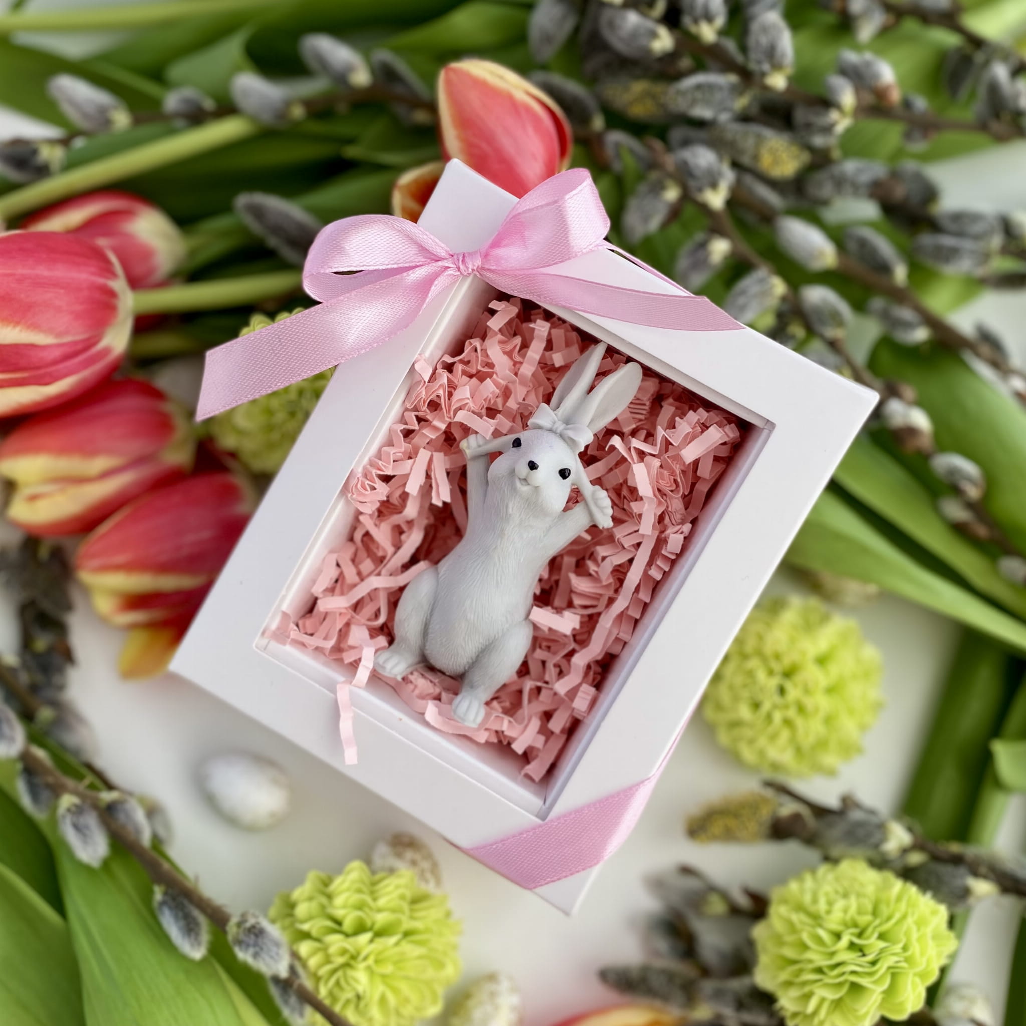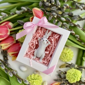 Ozdoba mydlana KRÓLIK Z KOKARDKĄ jest wykonana ręcznie z pasją i dbałością o najmniejsze szczegóły. Królik z Kokardką w Uszach – uroczy, mydlany rozrabiaka, który od razu poprawia humor! Jego długie uszka ozdobione kokardką dodają mu niezwykłego wdzięku. Idealny na radosny upominek, który wniesie odrobinę wiosennej magii!