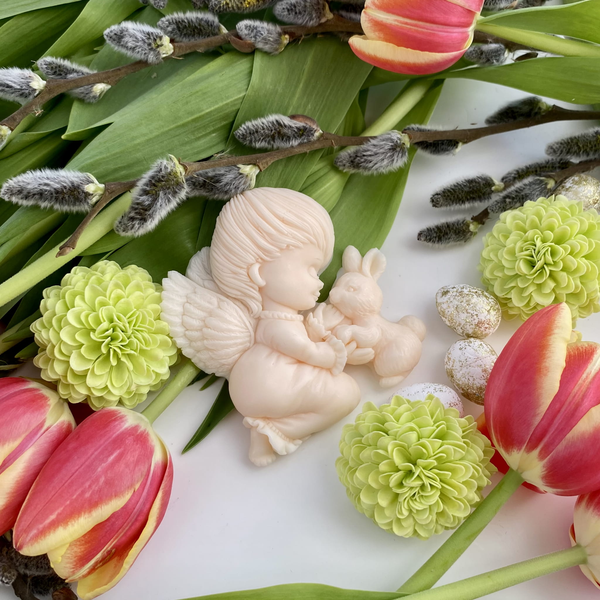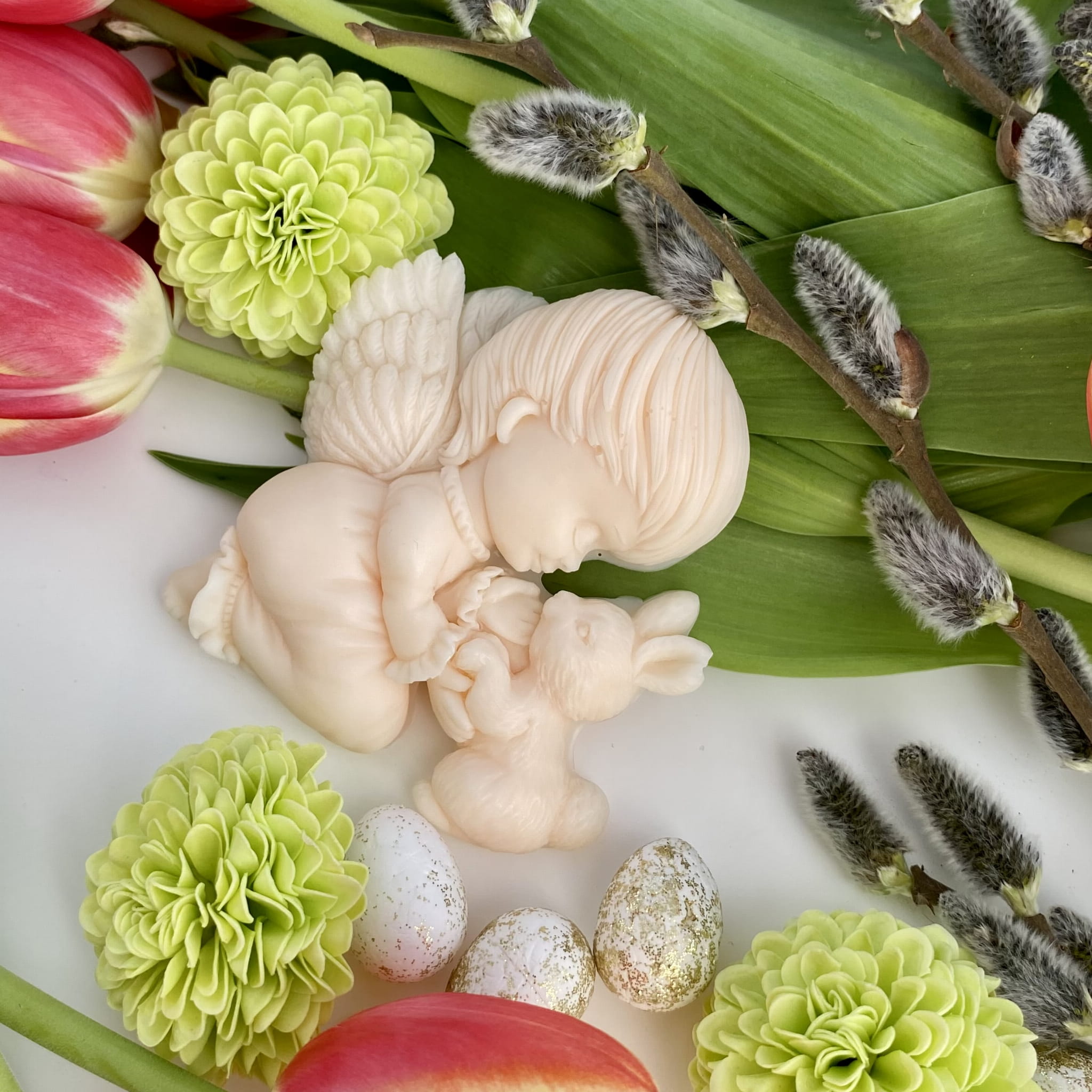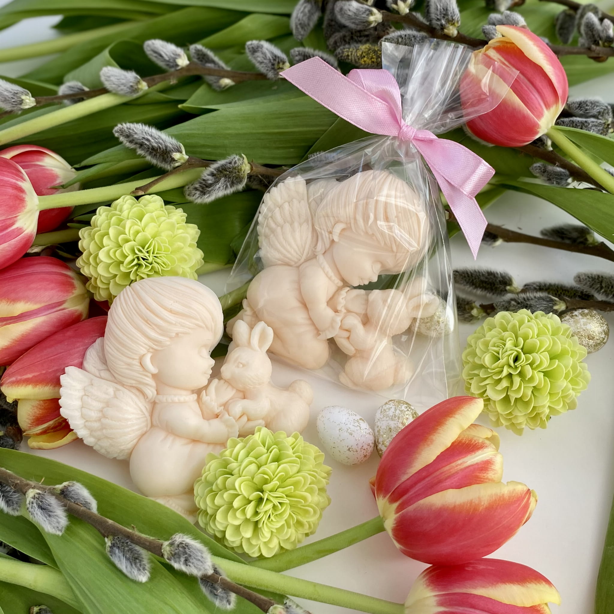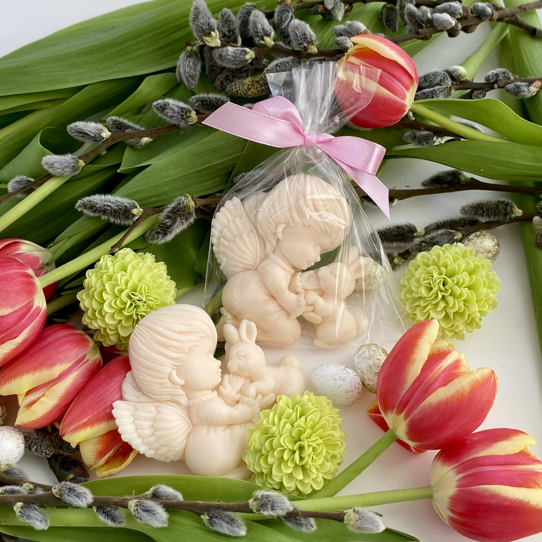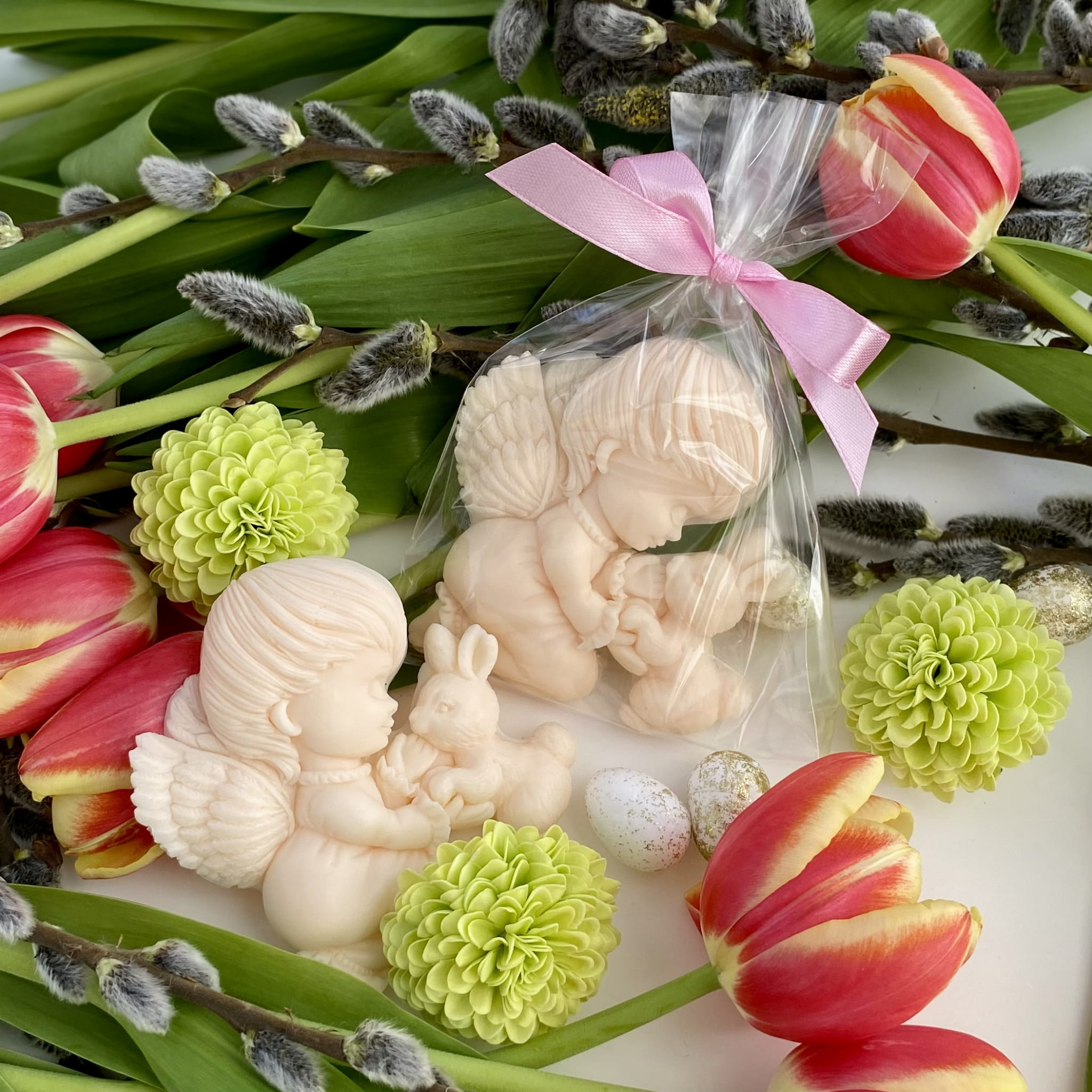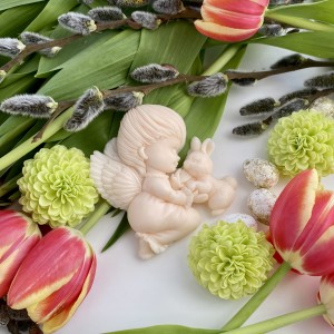 Ozdoba mydlana ANIOŁEK Z ZAJĄCZKIEM jest wykonana ręcznie z pasją i dbałością o najmniejsze szczegóły. Aniołek z zajączkiem to pełen czułości wiosenny duet, który zachwyca swoją delikatnością. Idealny na upominek pełen ciepła i wiosennej radości!