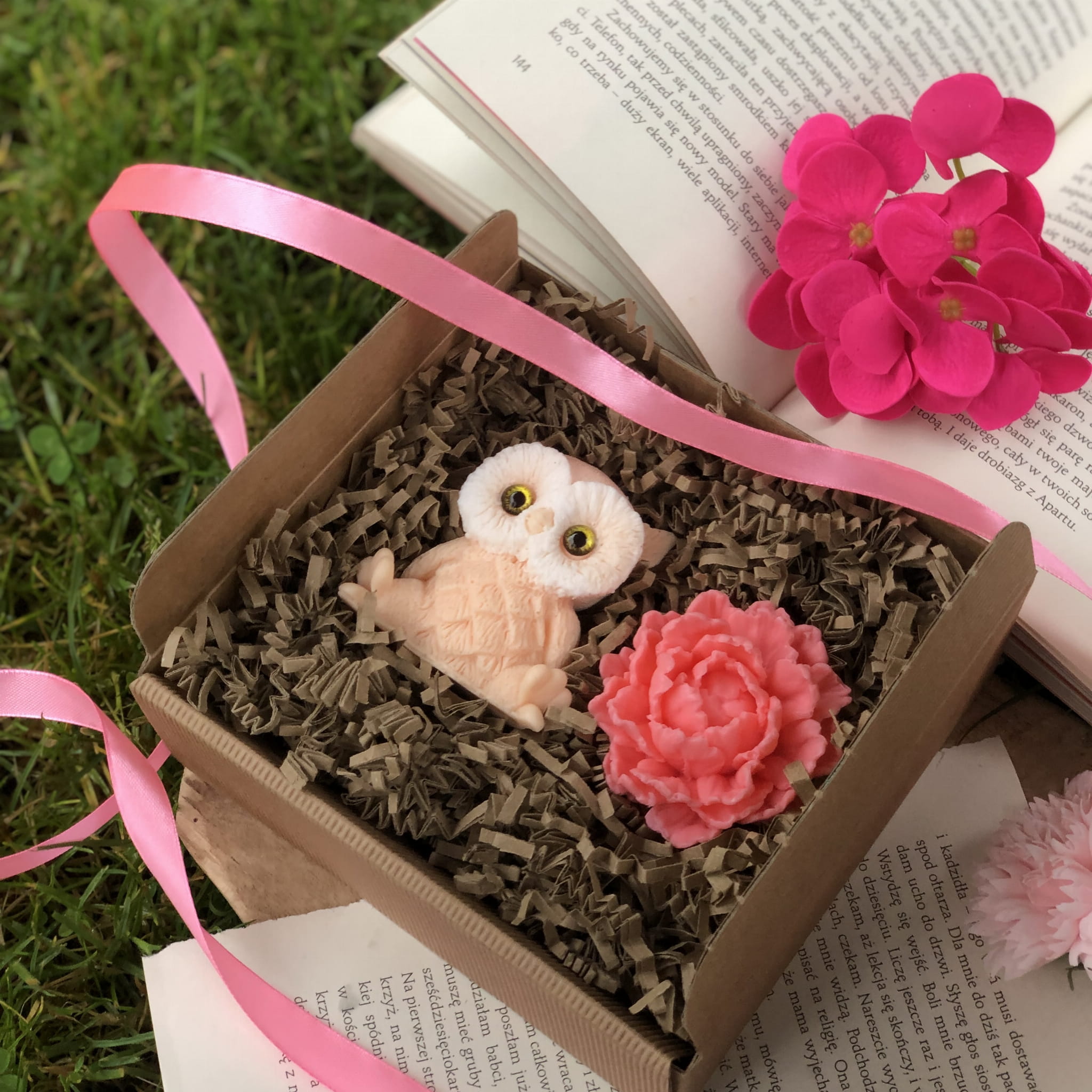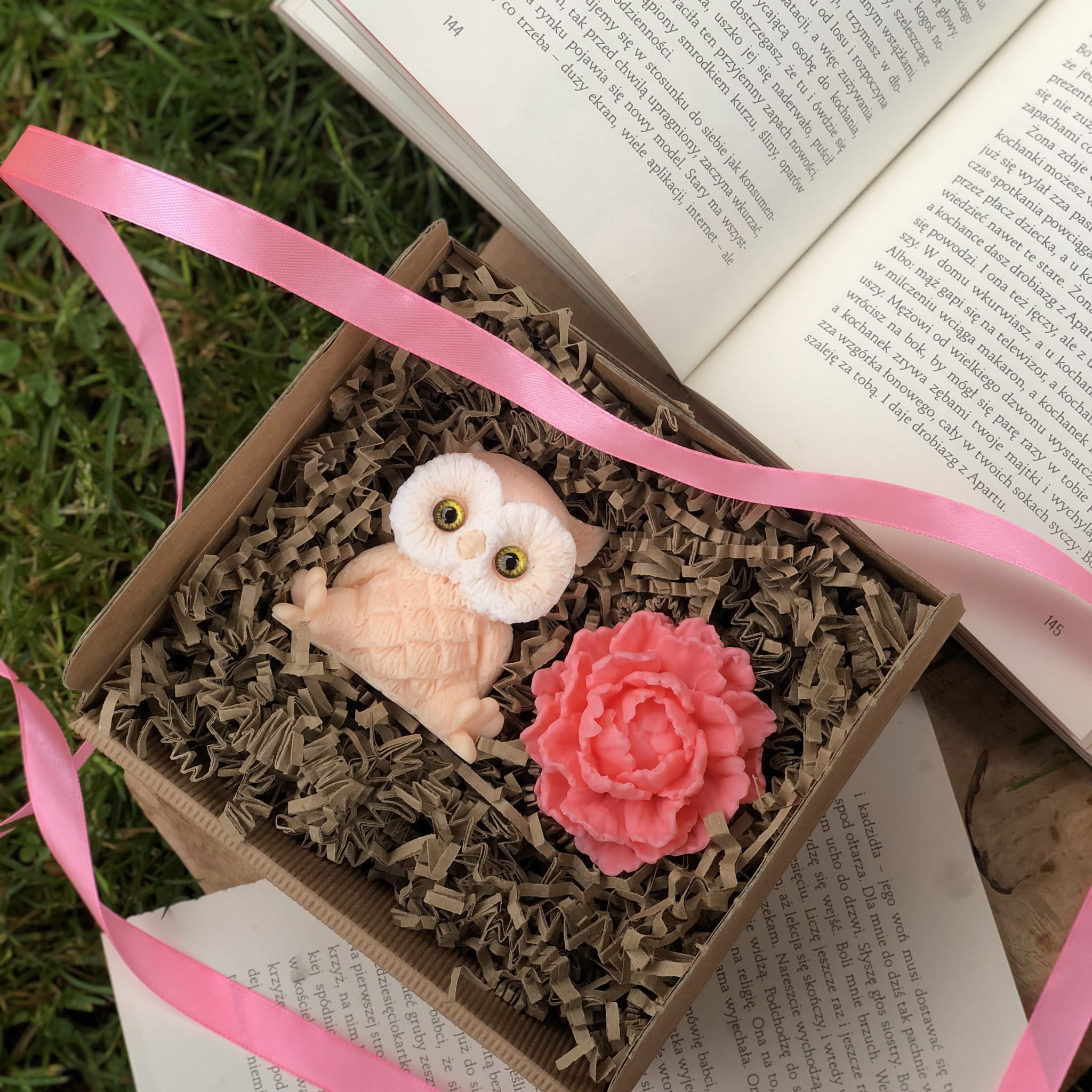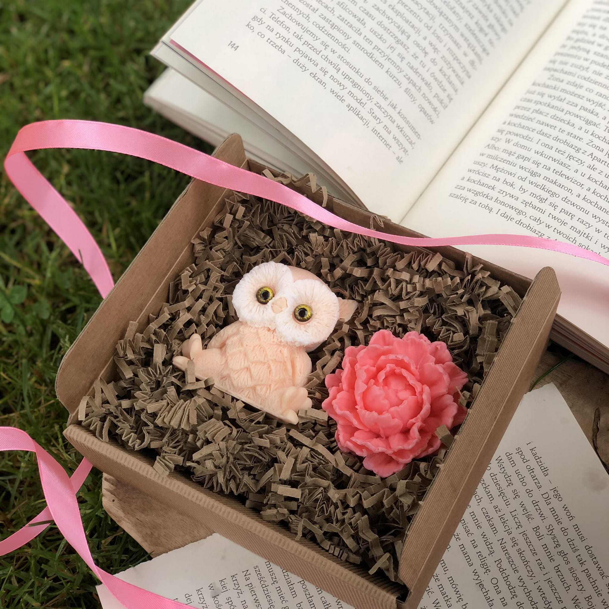 Mydlany ZESTAW Sowa i Piwonia Ecru to połączenie elegancji, symboliki i zapachu zamknięte w dwóch ręcznie wykonanych figurkach. Sowa – symbol mądrości – i delikatna piwonia tworzą razem prezent, który zachwyca nie tylko formą, ale i zapachem poziomki