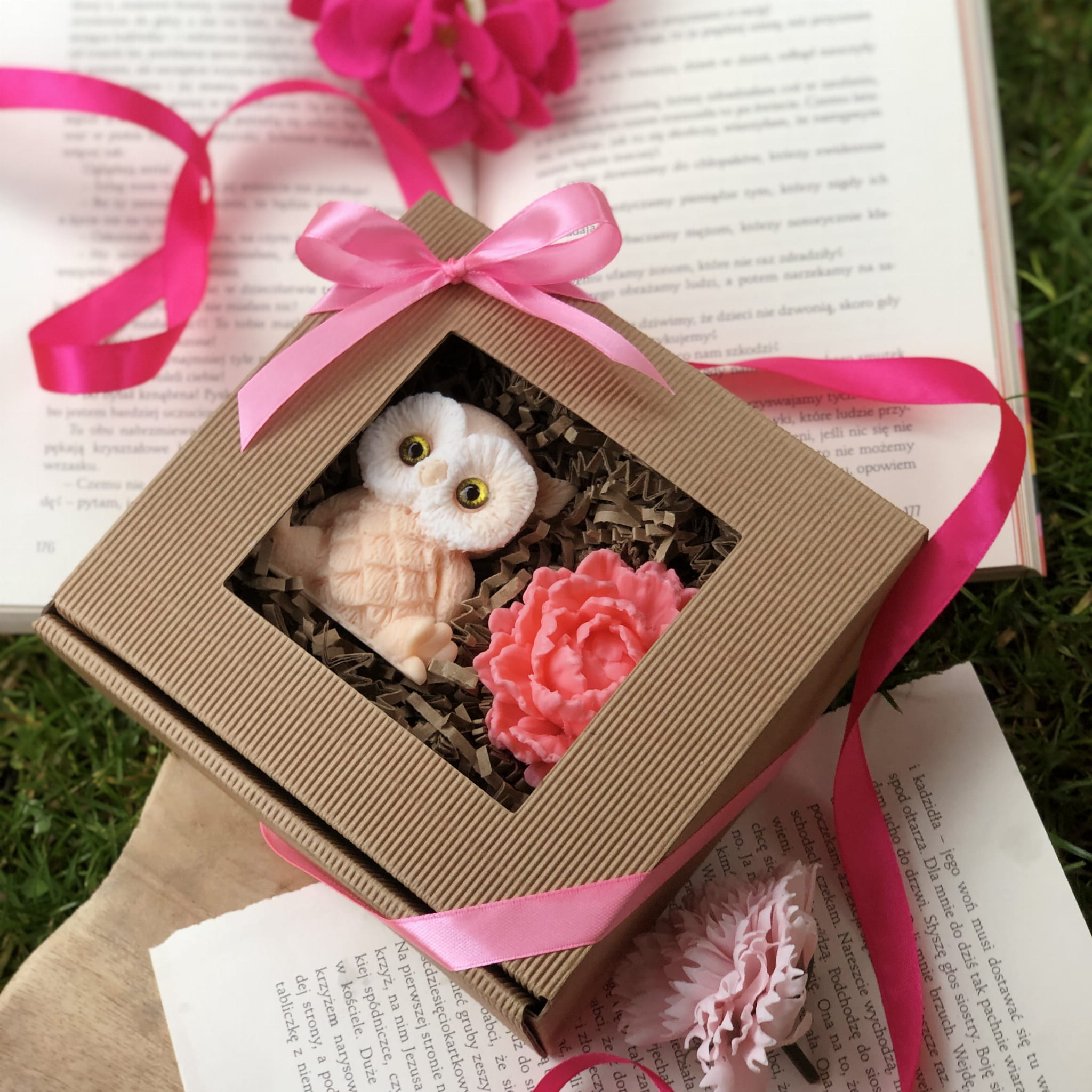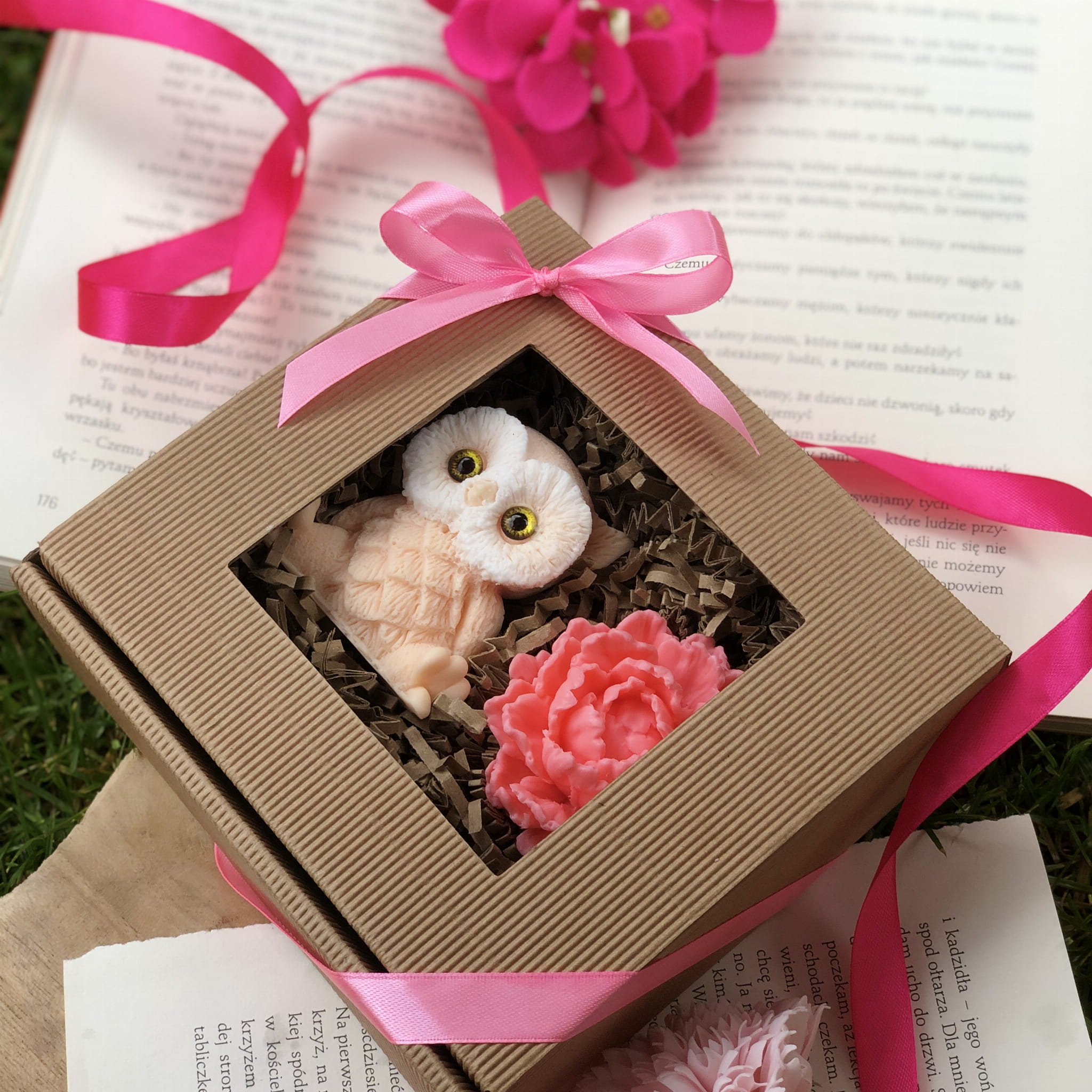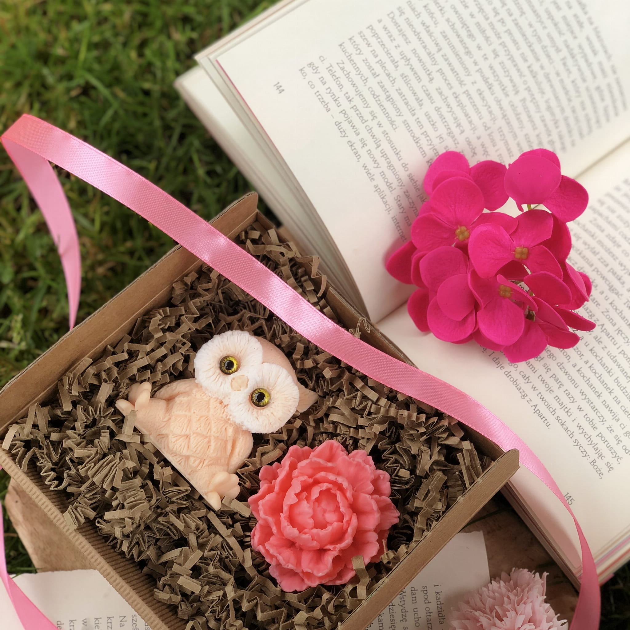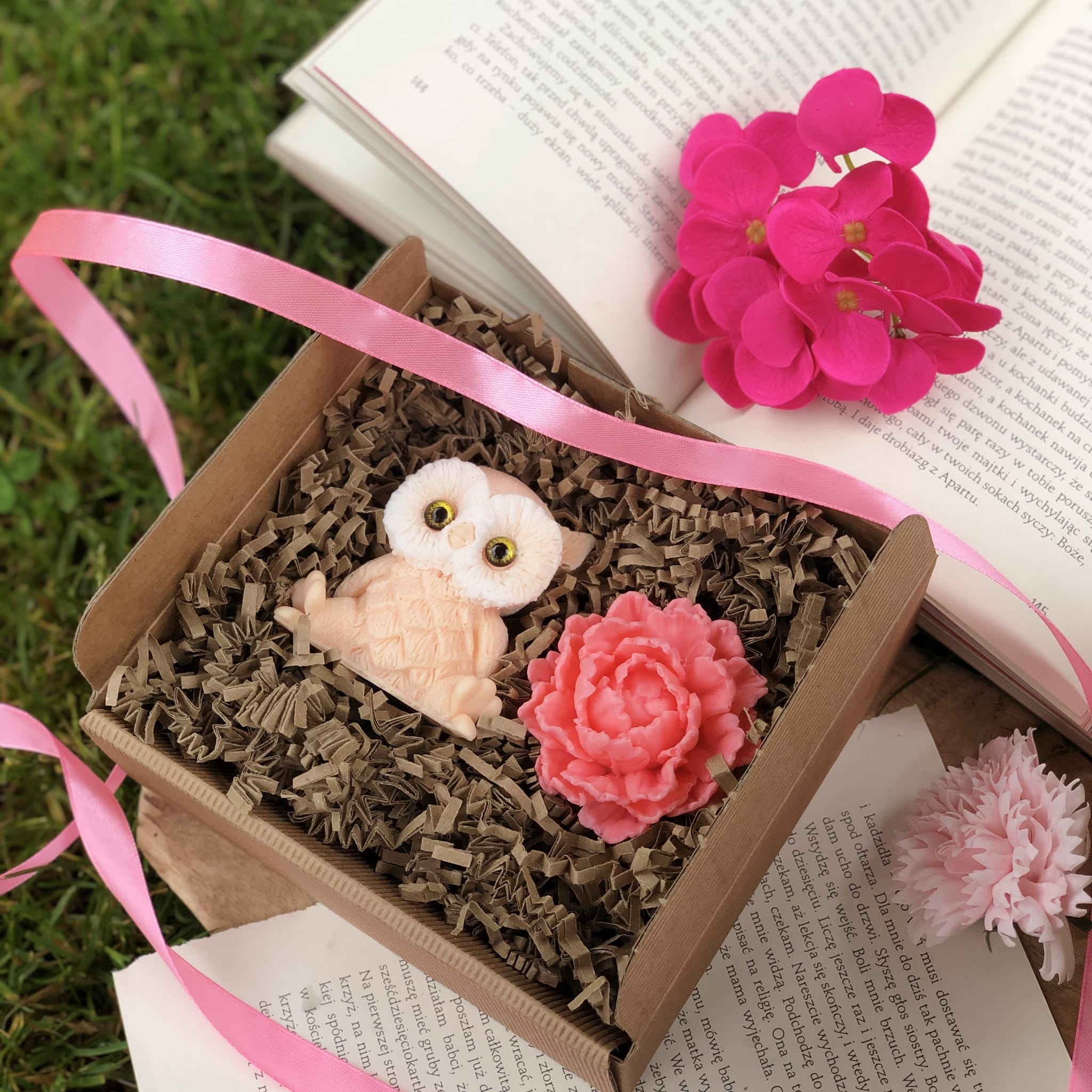 Mydlany ZESTAW Sowa i Piwonia Ecru to połączenie elegancji, symboliki i zapachu zamknięte w dwóch ręcznie wykonanych figurkach. Sowa – symbol mądrości – i delikatna piwonia tworzą razem prezent, który zachwyca nie tylko formą, ale i zapachem poziomki